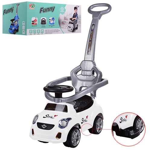 Оригинальный дизайн; Родительская ручка; Пластиковый корпус; Колеса пластиковые; Музыка, свет (на батарейках, в комплект не входят); Комфортное сиденье со спинкой; Бампер безопасности